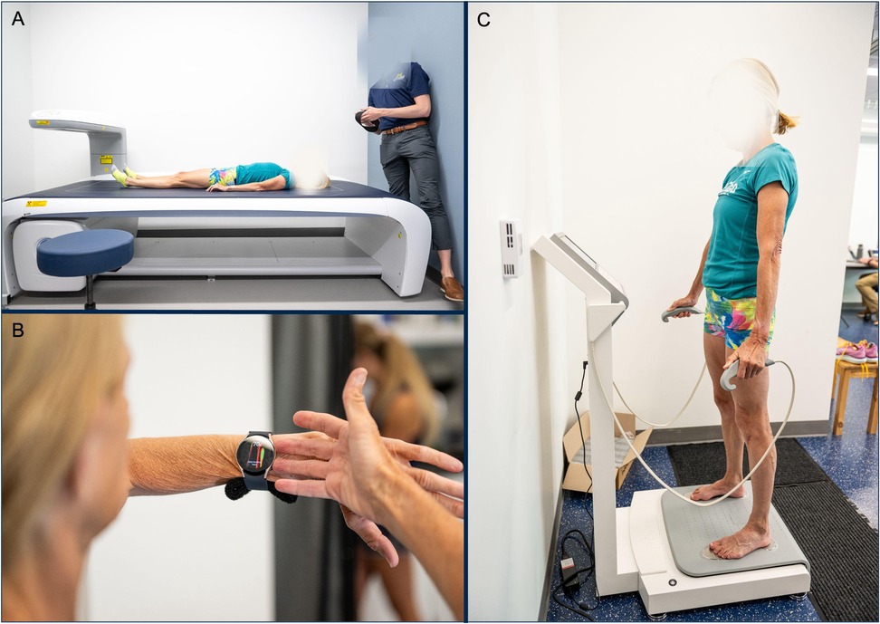 Figure 1. image of methodology to collect body composition from (A). DXA, (B). wearable smartwatch BIA (wearable-BIA) and (C). clinical standing hand-to-foot BIA analyzer (clinical-BIA).