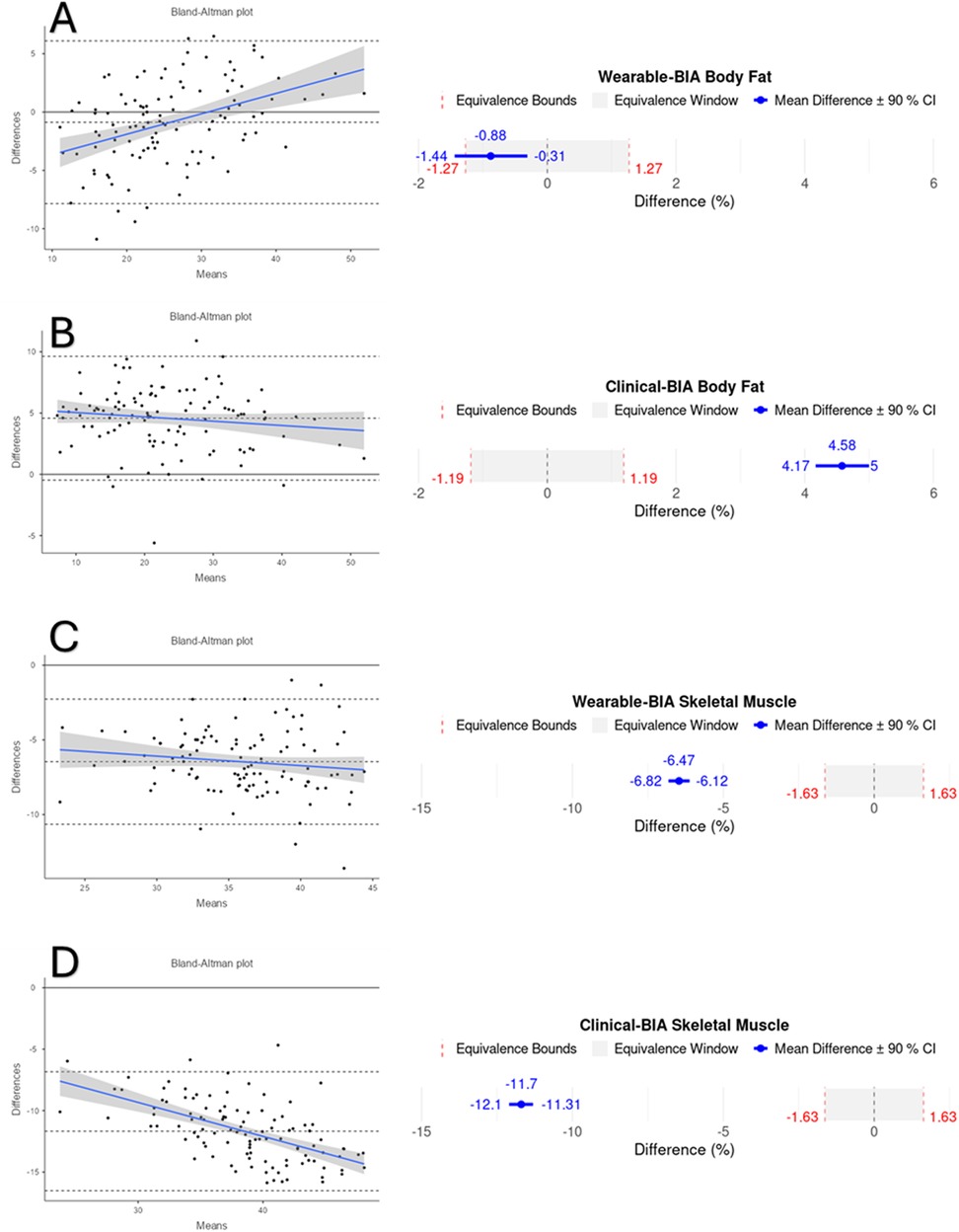 Figure 2. Bland-Altman and equivalency plots for combined BF% and SM% data for wearable-BIA and clincal-BIA devices compared to criterion measurement (DXA). Wearable-BIA BF% results found in panel (A), Clinical-BIA BF% results found in panel (B). Wearable-BIA SM% results found in panel (C), Clinical-BIA SM% results found in panel (D). Blue lines on Bland-Altman plots represent the proportional bias line with shadings representing 95% confidence intervals of proportional bias line. X-axis is the mean of the two measurements with the Y-axis the difference between the two measurements. The mean bias line and upper and lower limits of agreement are shown in dashed lines (mean bias being the middle-dashed line). The solid line represents the hypothetical mean bias of 0. Equivalence window for equivalence plots determined based on 10% of criterion mean (±5%).