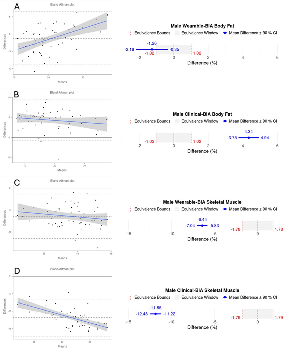 Figure 3. Bland-Altman and equivalency plots for male participant BF% and SM% data for wearable-BIA and clinical-BIA devices compared to criterion measurement (DXA). Wearable-BIA BF% results found in panel (A), Clinical-BIA BF% results found in panel (B). Wearable-BIA SM% results found in panel (C), Clinical-BIA SM% results found in panel (D). Blue lines on Bland-Altman plots represent the proportional bias line with shadings representing 95% confidence intervals of proportional bias line. X-axis is the mean of the two measurements with the Y-axis the difference between the two measurements. The mean bias line and upper and lower limits of agreement are shown in dashed lines (mean bias being the middle-dashed line). The solid line represents the hypothetical mean bias of 0. Equivalence window for equivalence plots determined based on 10% of criterion mean (±5%).