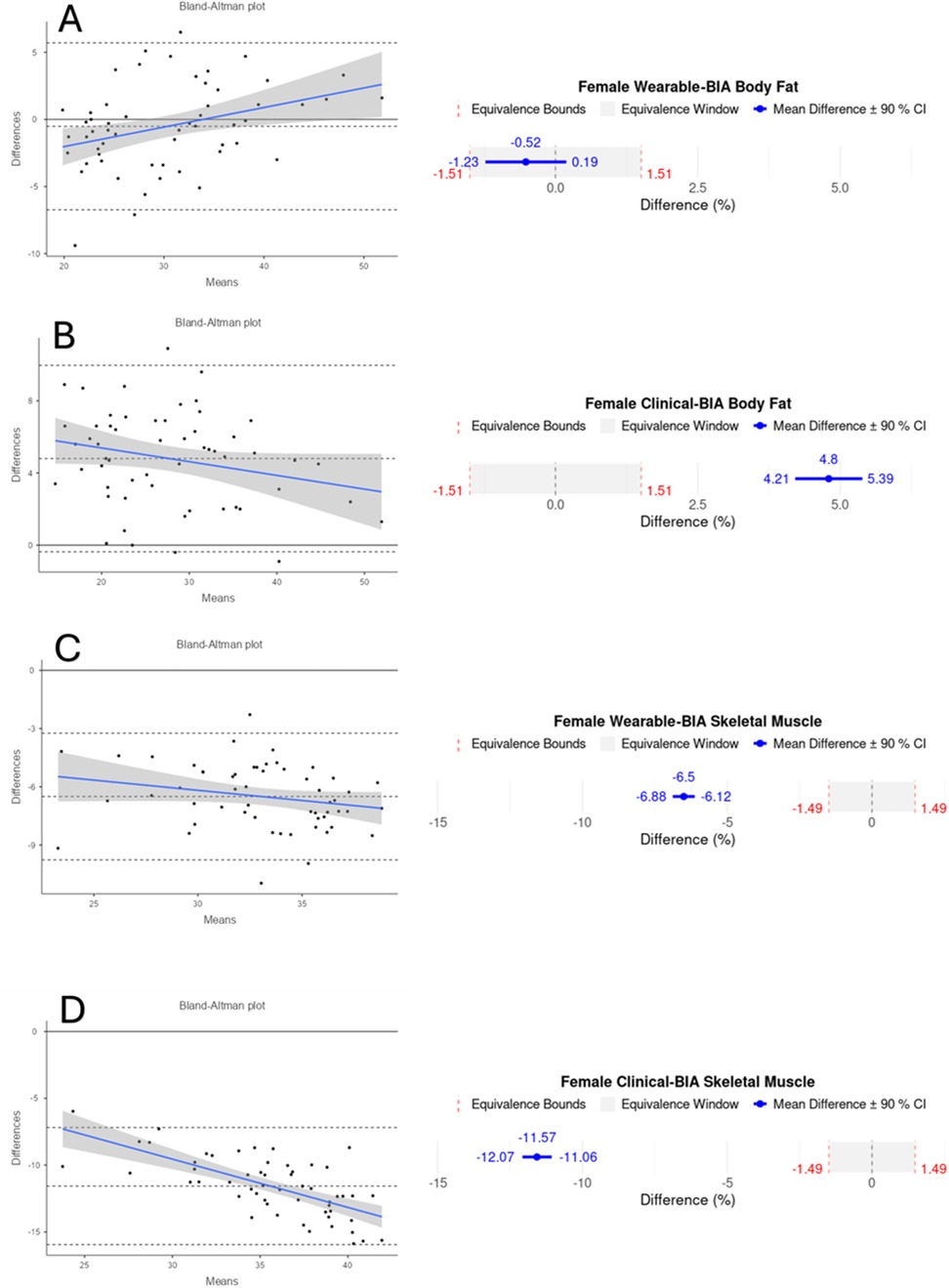 Figure 4. Bland-Altman and equivalency plots for female participant BF% and SM% data for wearable-BIA and clinical-BIA devices compared to criterion measurement (DXA). Wearable-BIA BF% results found in panel (A), Clinical-BIA BF% results found in panel (B). Wearable-BIA SM% results found in panel (C), Clinical-BIA SM% results found in panel (D). Blue lines on Bland-Altman plots represent the proportional bias line with shadings representing 95% confidence intervals of proportional bias line. X-axis is the mean of the two measurements with the Y-axis the difference between the two measurements. The mean bias line and upper and lower limits of agreement are shown in dashed lines (mean bias being the middle-dashed line). The solid line represents the hypothetical mean bias of 0. Equivalence window for equivalence plots determined based on 10% of criterion mean (±5%). Equivalency test supported for Females wearable-BIA BF% condition only.