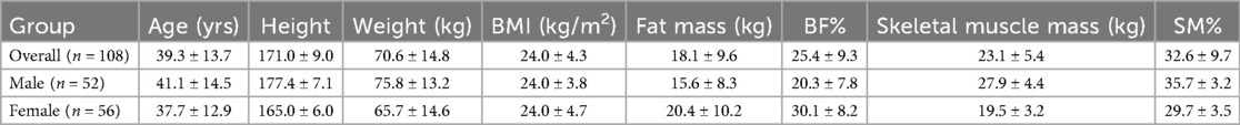 Table 1. Participant demographics reported as ± standard deviation. Fat mass, body fat percentage (BF%), skeletal muscle mass, and skeletal muscle percentage (SM%) measures are reported from DXA results.