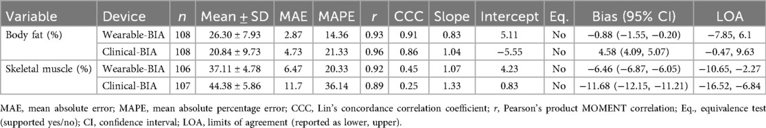 Discussion: Both the wearable- and clinical-BIA device revealed mixed validity, demonstrating strong correlations for both BF% and SM%, and high levels of agreement and low error for BF%. Additionally, the wearable-BIA demonstrated acceptable accuracy for estimating BF% in females. However, wider limits of agreement and variability suggest limitations in validity, particularly for skeletal muscle mass and in individuals with higher body fat percentages. These findings support the practical use of wearable devices for general body composition monitoring when laboratory-based methods are unavailable, though caution is warranted. Continued development and validation efforts are recommended to enhance accuracy and consistency across diverse populations and measures.