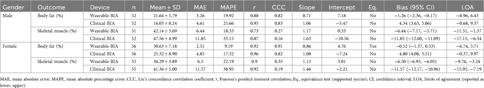 Both the wearable- and clinical-BIA device revealed mixed validity, demonstrating strong correlations for both BF% and SM%, and high levels of agreement and low error for BF%. Notably, BF% estimation for female participants met all accuracy thresholds, including low MAPE, high correlation, and equivalence with DXA values. This finding suggests that female users may have greater confidence in the wearable-BIA device's measurements, highlighting its potential as a practical and reliable tool for body composition monitoring in this population. It is important to note that the thresholds utilized for the current investigation of MAPE < 10%, CCC > 0.7, and equivalence supported at a window of 10% (±5%) based on 90% CI's, are relatively liberal, and chosen as we believe it is sufficiently stringent for testing consumer-grade devices for recreational use. As acceptable thresholds have not been widely established (24), those looking to utilize these devices for other purposes (athletics, research, clinical, etc.) may choose to apply more stringent validity thresholds than what we have chosen.