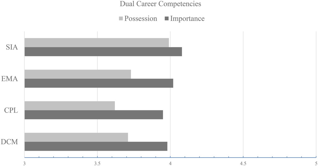 Figure 1. Comparison of mean perceived importance and possession across the four dual-career competency domains.