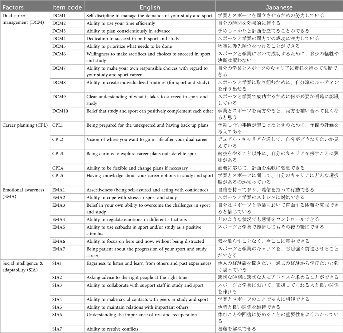 Conclusion: The DCCQ-AJ is a psychometrically sound web-based instrument for assessing dual-career competencies among Japanese student-athletes. Its scalability and structural equivalence to the original DCCQ-A render it suitable for cross-cultural comparative studies and longitudinal monitoring. This tool has practical utility for researchers and institutions aimed at evaluating and enhancing dual-career support frameworks in higher education and elite sports contexts.