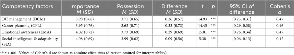 To examine item discrimination, we conducted a Good–Poor (G–P) analysis by comparing the mean item scores between the top and bottom 25% of respondents based on the total DCCQ-AJ scores. The factorial structure of the DCCQ-AJ was assessed using confirmatory factor analysis (CFA), adopting the same four-factor model as the original. Model fit was evaluated using the root mean square error of approximation (RMSEA), comparative fit index (CFI) (29), and Tucker–Lewis index (TLI) (30). Model fit was considered acceptable if the RMSEA was below 0.08 and both CFI and TLI exceeded 0.90, as recommended by Hu and Bentler (31) and Marsh et al. (32). The internal consistency reliability was assessed by calculating Cronbach's alpha (33) for each competency factor. Following the validation process, we calculated descriptive statistics (means and standard deviations) for both the perceived importance and possession levels across the four competency domains. Paired-sample t-tests were conducted to compare perceived importance and possession scores. In addition to p-values, effect sizes (Cohen's d) and 95% confidence intervals for the mean differences were calculated to assess the magnitude and precision of the effects. All analyses were performed using IBM SPSS Statistics 27.0 and AMOS 27.0.