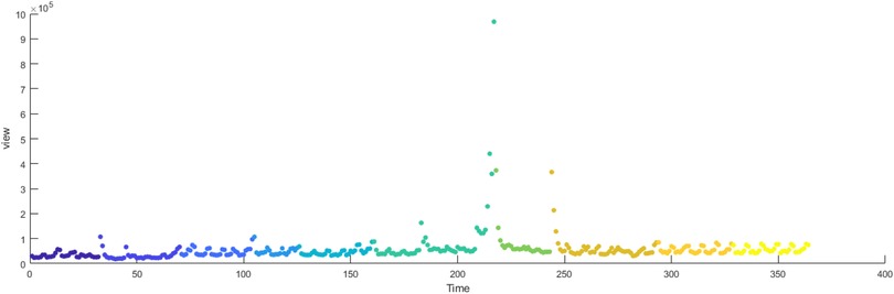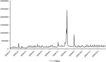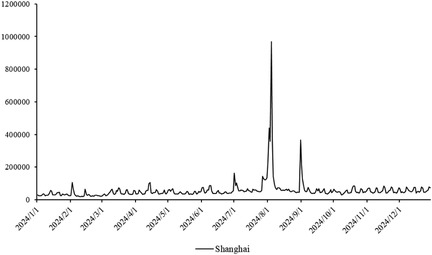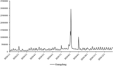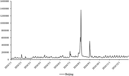 The primary dataset consists of daily search volume counts for the keyword “badminton” on Douyin (the Chinese counterpart of TikTok), collected via the Douyin Open Platform API (v2.0) with official data access authorization. The data covers four geographic units to capture regional and national dynamics, We collected search frequency data from Beijing, Shanghai, Guangdong and China spanning January 2024 to December 2024. As illustrated in Figure 3, the -axis represents time (by date), while the -axis denotes the daily search volume, as shown in Figures 2–5.