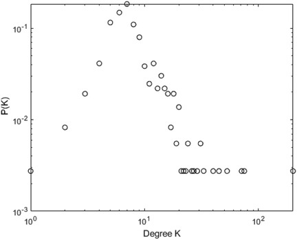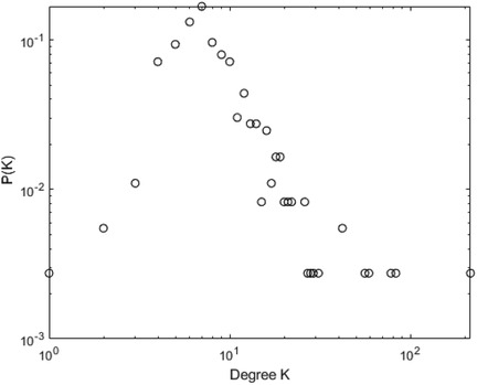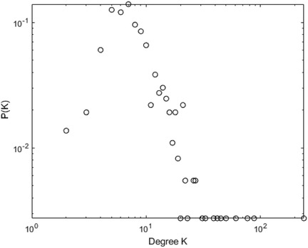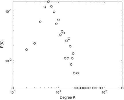 Periodic time series map to regular network graphs, and their degree distribution follows a discrete distribution. Fractal time series map to scale-free network graphs, and their degree distribution obeys a power-law distribution. Both random time series and chaotic time series can be mapped to horizontal visibility graphs with exponential degree distribution. This means the node degree distribution of the graph follows an exponential distribution, where the cumulative distribution appears approximately as a straight line in a semi-logarithmic coordinate system. The degree distribution of the graph is expressed by the formula as shown in Equation 1: