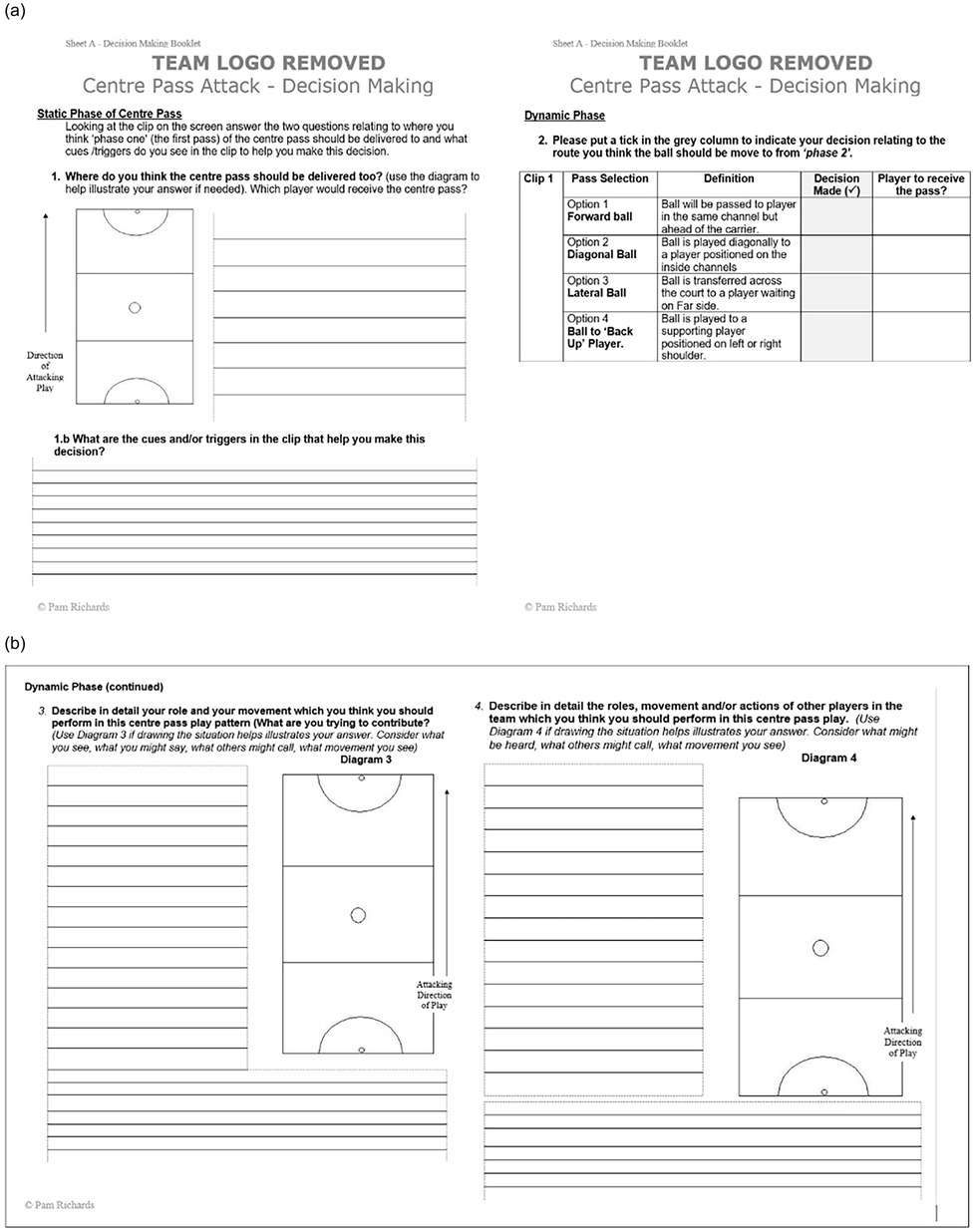 Players were familiarized with the process of viewing clips in three phases. Players were presented with a DM booklet in team video meetings. The DM booklet consisted of sheet A and sheet B endorsed by the coaching team. Sheet A would be used to review clips 1, 2, 4 and 5 (Figure 2a). Players were required to write their reflection at specific phases of the ACP based on observations and reflections of the video. Question 1 related to phase one (when the centre player was standing with the ball waiting for the whistle), in which the players were asked to reflect on the information and cues in the environment which they needed to be aware of (this matched the team SMMs). Question 2 related to phase two for the centre pass, where players were asked to reflect and make a decision indicating where the most effective pass should be played. For clips 1, 2, 4 and 5 the video was played and stopped at the phases outlined above, and the players wrote their responses in the DM booklet. After the players had written their responses, the clip was played again and the group discussed the clip in relation to cues in the environment, role of the teammates and the relevance of the clip in the context of the team SMMs.