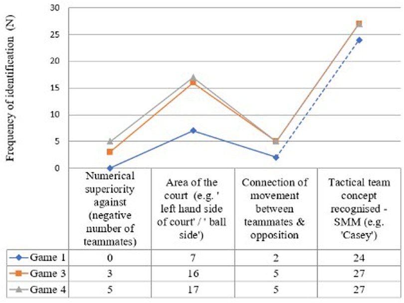 Figure 5 highlights a decline by all playing units in game 2. This replicates the finding of Bate and Richards (31), Richards et al. (4), and is perceived to be linked to players engaging in a “sensemaking” process where SMMs are being checked and refined. The remaining four themes have been identified as important but not dominant. These four themes are (i) “SMM concept linked to space”; (ii) “area of the court and player positioning” (e.g., offline/online); (iii) “team SMMs” (SMMs linked specifically to team philosophy); and (iv) “teammates undefended” (free player).