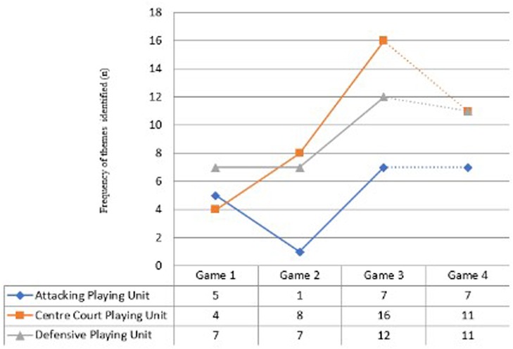 Figure 5 illustrates an increase in the identification of the theme relating to recognition of “multiple players recognized and the connection to teammates”. All playing units increased their identification of this theme over the four match period. Centre court players increase their identification progressively over games 1–3 with recognition values of n = 4, n = 8 and n = 16 respectively.