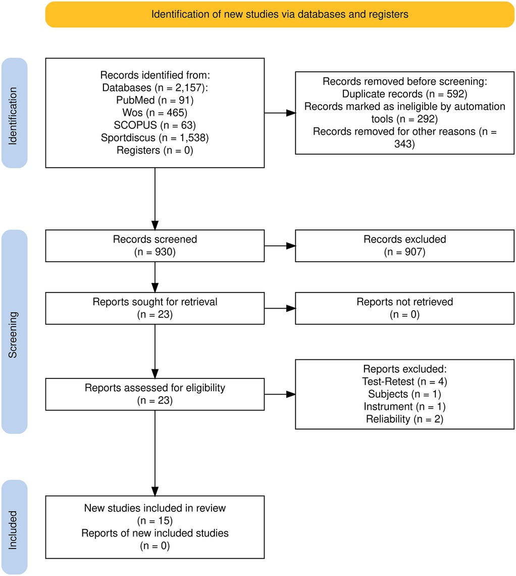 An initial electronic search identified 2,157 potentially relevant references from the databases (PubMed, n = 91; WoS, n = 465; SCOPUS, n = 63; Sportdiscus, n = 1,538). After removing 1,227 duplicates, 907 articles were excluded after reviewing their titles and abstracts. This left 23 studies for full-text review, of which eight were excluded for the following reasons: four did not include a test-retest design, one targeted a population outside the scope of the review, one did not use measurement instruments, and two did not report reliability data. Ultimately, 15 studies met the inclusion criteria. However, substantial variability was observed in the grip types (21), edge depths, and protocols used, resulting in widely varying Intraclass Correlation Coefficient (ICC) values, even within individual studies. Across all studies, ICCs ranged from 0.294 to 1, with a median value of 0.86. This marked heterogeneity in the reported data and study designs precluded the possibility of conducting a meta-analysis.