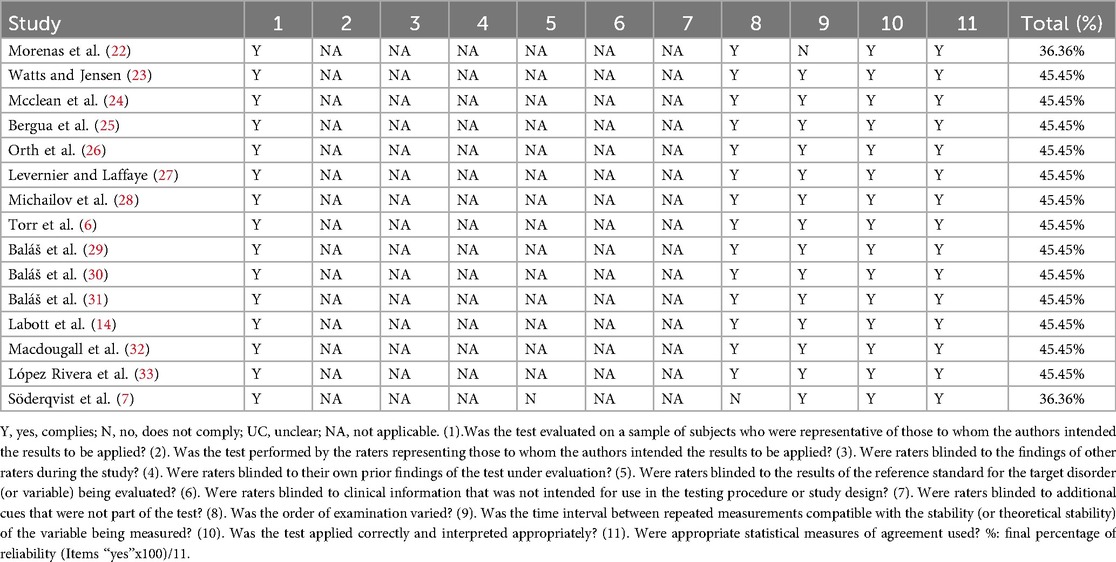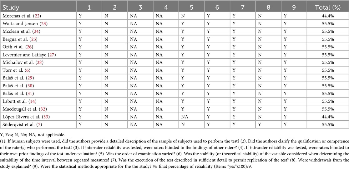 The methodological qualities of the selected studies were evaluated using the Critical Appraisal Tool (CAT) (19) and the Quality Appraisal of Reliability Studies (QAREL) (20). The CAT scale consists of 13 items assessing both reliability and validity; however, because this review focused exclusively on reliability outcomes, only the 9 items directly related to reliability were analyzed, while validity-related items were excluded since instrument validity data were inconsistently reported across studies. This approach minimized uncontrolled variability and ensured that final quality scores reflected methodological rigor in reliability assessment alone. The QAREL scale contains 11 items: items 1–2 address sample bias and participant representativeness; items 3–7 evaluate evaluator blinding; item 8 concerns the order of subject evaluations; item 9 assesses the interval between repeated measurements; item 10 evaluates whether the test was appropriately applied and interpreted; and item 11 addresses statistical analysis (20). Final quality scores were expressed as percentages, with 90% indicating the highest methodological quality and scores above 45% considered indicative of high-quality studies, following criteria from previous methodological reviews in sports science. We acknowledge that while CAT and QAREL are widely used for methodological appraisal, they have inherent limitations when applied specifically to reliability studies; therefore, these quality ratings should be interpreted cautiously, and the conclusions of this review consider such constraints.