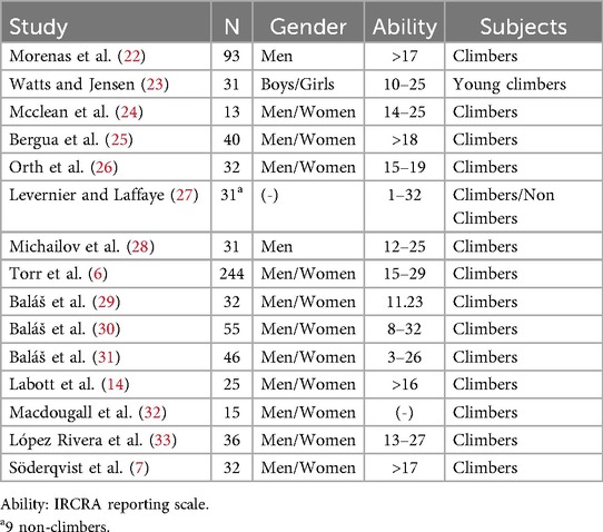 The total sample size included 747 participants across the 15 (6, 7, 13, 14, 22–25, 27–33) studies, ranging from 13 to 244 climbers with varying performance levels (IRCRA) (17). Additionally, 9 non-climbers were included in a single study (27) as a control group, in which the gender of the participants was not specified.