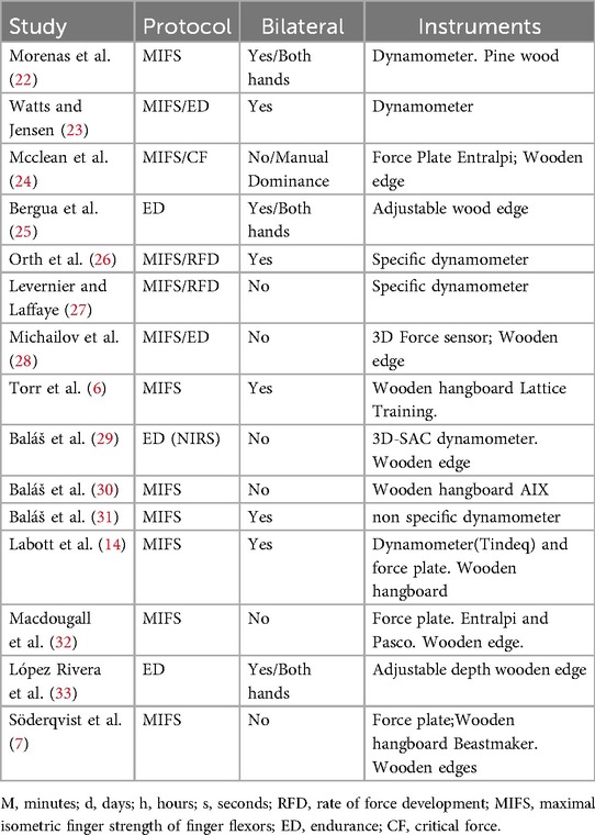 All measurements included some type of evaluation instrument, with most studies using dynamometers to monitor these measurements and edges (gripping surfaces of varying sizes), which could be adjustable or fixed at different depths. Three studies (6, 25, 33) did not use dynamometers or electronic instruments to monitor test data. Instead, one study (25) employed a measurement device during the warm-up phase, another (33) determined measurements based on grip depth until muscular failure, and the last (six) used additional weights for climbers, if necessary, to establish the measurement (6). Seven studies (22, 23, 26–29, 31) used specialized force sensors or dynamometers. Four articles (7, 24, 30, 32) used force platforms or electronic scales, one of which (Entralpi Force Plate) was featured in two studies (24, 32) and is specifically designed for measuring various climbing-related parameters. A previous study (14) combined two measurement instruments: a climbing-specific dynamometer (Tindeq Progressor) and a generic force platform (Kistler Quattro).