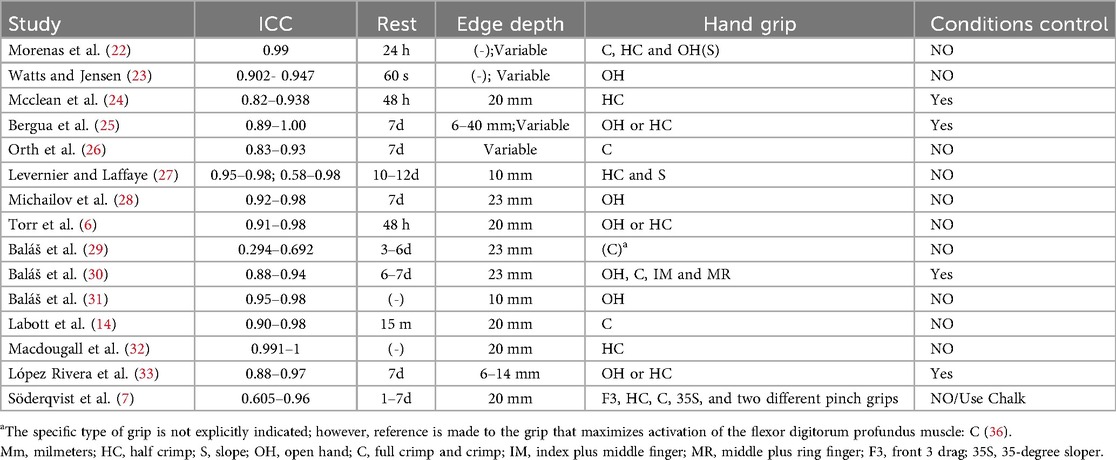 ICC values showed considerable variability across studies, as each study employed different grip types and positions based on the diverse characteristics of climbing grips (21). Despite this variability, most studies (6, 14, 22–26, 28, 30–33) (twelve in total) demonstrated good to excellent reliability in their measurements, with ICC values exceeding 0.75. This indicates that the measurements were generally consistent and reproducible. The remaining three studies (7, 27, 29) displayed greater variability, with some tests yielding lower ICC values (low to moderate reliability). In one study (7), the lowest recorded value (F3 Left = 0.605) was attributed by the authors to potential measurement errors, suggesting that testing conditions may have influenced the consistency of the results. Another study (29) specifically evaluated the reliability of Near-Infrared Spectroscopy (NIRS) by simulating climbing grips through intermittent contractions.