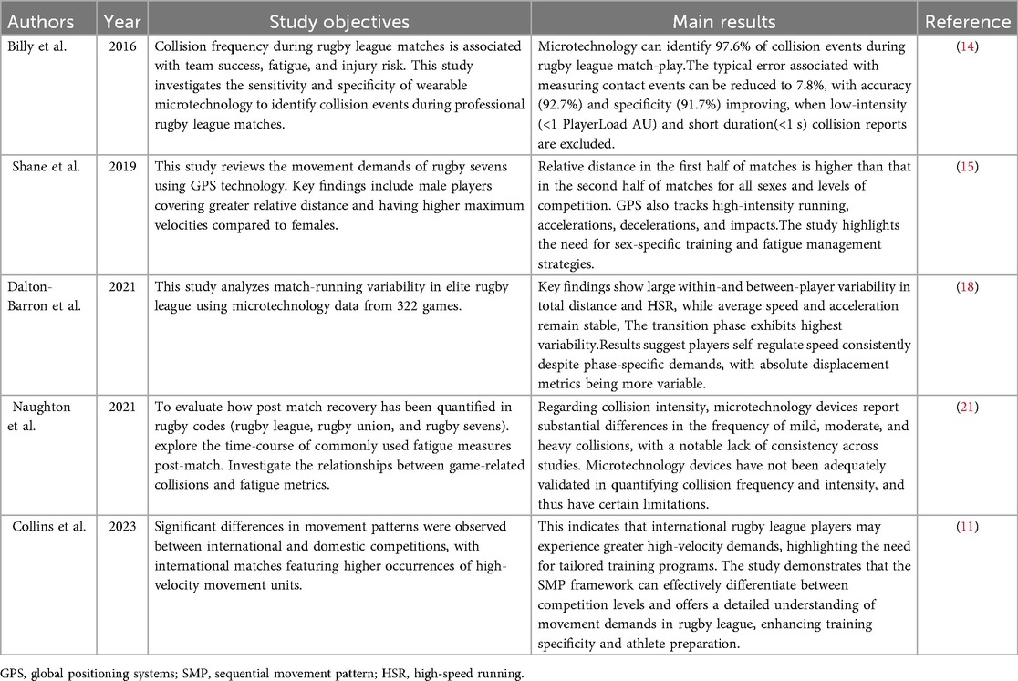 In the context of rugby, the integration of Global Positioning Systems (GPS) with various sensors—such as accelerometers, gyroscopes, and magnetometers—permits the real-time acquisition of data pertaining to athletes' positions, speeds, accelerations, and changes in direction. This wealth of data provides robust support for the analysis of movement patterns (13). Despite its efficacy in quantifying movement patterns and external load in rugby match play, GPS technology is limited by sampling frequency (e.g., 10 Hz), signal interference, and its inability to directly capture biomechanical details (such as changes of direction and contact actions) (9, 11). Therefore, integrating multimodal data is essential to enhance the reliability of analysis (9, 11) (Table 1).