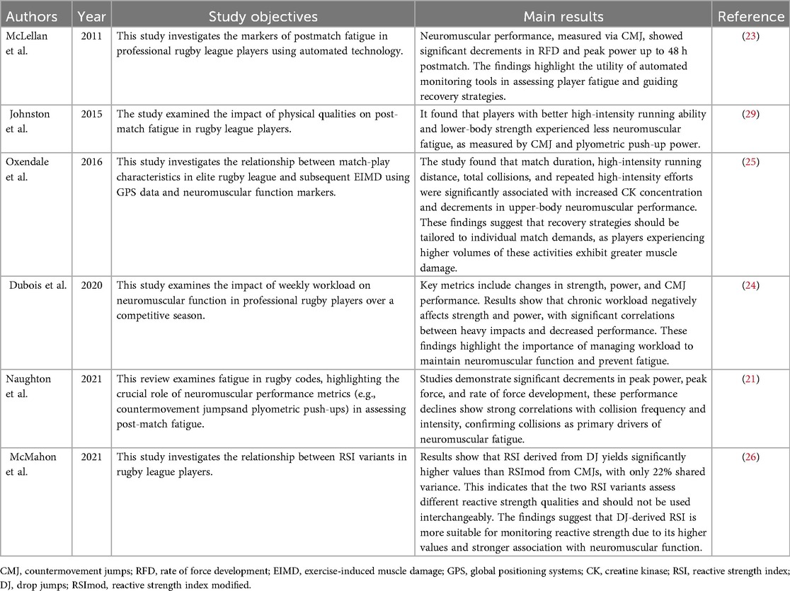 Table 2. Summary of key findings on training load in rugby players using neuromuscular function monitoring technologies.