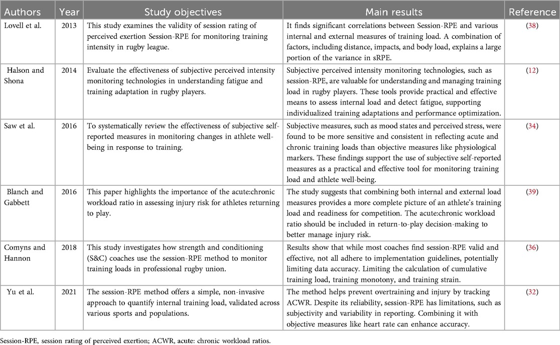 Table 3. Summary of key findings on training load in rugby players using subjective perceived intensity monitoring technologies.