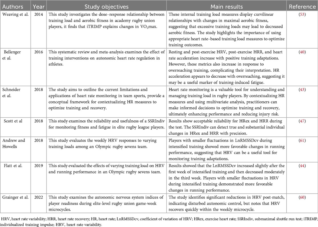 Table 4. Summary of key findings on training load in rugby players using heart rate monitoring technologies.