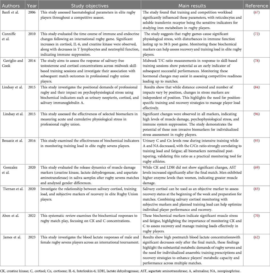 Table 5. Summary of key findings on training load in rugby players using biochemical indicator-based monitoring technologies.