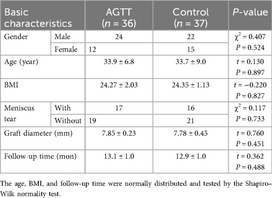 The basic characteristics of the AGTT group and control group were listed below, no significant difference of gender, age, BMI, whether combined with meniscus tear, graft diameter, and follow-up time was observed between the 2 groups (Table 2).