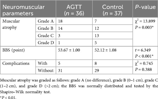 At the end of the 8th week after ACLR (AGTT rehabilitation was also completed at the 8th week), the rate of grade A of muscular atrophy grading system in the AGTT group was significantly higher than the control group (50.0% vs. 18.9%, P = 0.003) (Table 3), which also means the rate of grade B, C, D in the control group was significantly higher than the AGTT group (Table 3). The BBS of the AGTT group was significantly higher than that of the control group with the difference of 1.55 points (95% CI: 1.05–2.05) (Table 3).