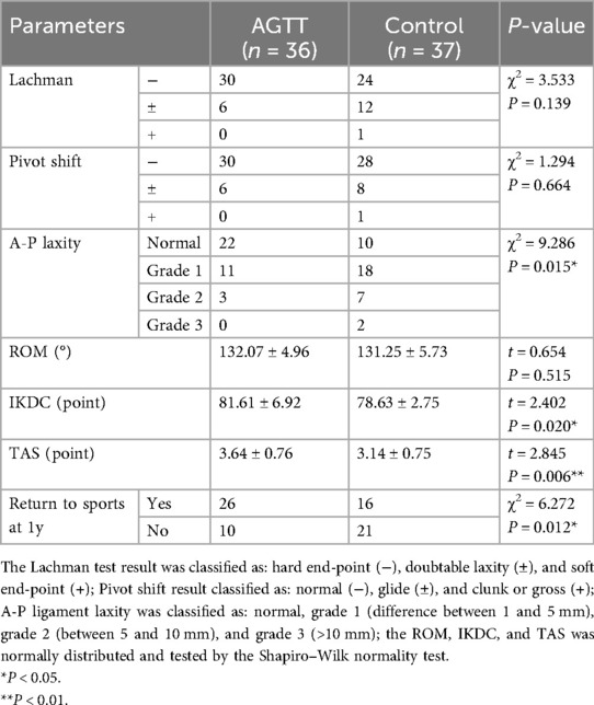 At 1y follow-up, the rate of normal A-P laxity, IKDC, TAS and rate of return-to-sport in the AGTT group were significantly higher than that in the control group (Table 4). AGTT improved return-to-sport by 29 percentage points (72.2% vs. 43.2%, P = 0.012) than the control group (Table 4). The Lachman test, pivot shift test, and ROM did not show a significant difference between the 2 groups (Table 4).