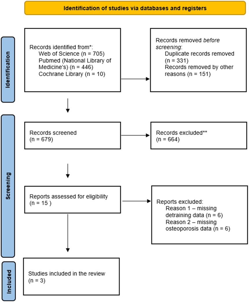 A total of 1,161 studies were retrieved from three databases [PubMed/MEDLINE (National Library of Medicine), Web of Science, and Cochrane Library]. Of these, 331 duplicates were removed. Before screening, 151 records were excluded due to ineligible publication language (non-English). The remaining 679 records underwent title and abstract screening; 664 were excluded due to ineligible study type (reviews, meta-analyses, case reports, abstracts, book chapters, opinion/position papers, editorials), not matching the topic, or lack of full text. Fifteen articles were assessed in full. Twelve were excluded (six did not include a detraining period and six did not report osteoporosis data). Thus, this systematic review comprised three studies.