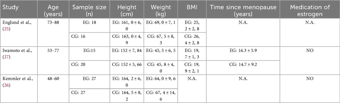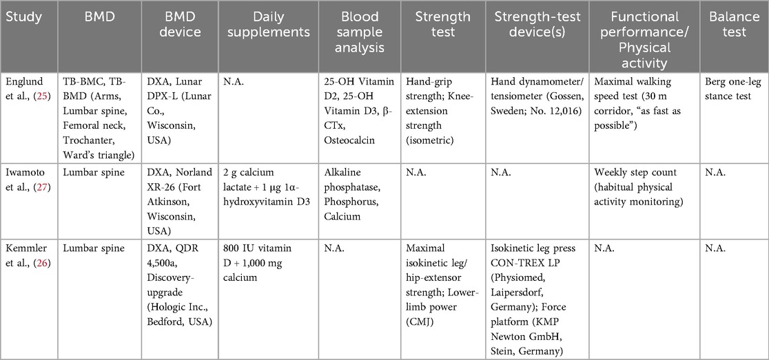 Table 3 provides us with the methods used in the included studies. Blood sample analysis used two studies to determine the level of bone parameters in pre- and post-tests (25, 27). Furthermore, two studies mentioned using dietary supplements throughout the intervention period among participants (26, 27). Englund et al. (25) assessed functional performance using the maximal walking speed test over a 30-meter walkway. Standing balance was evaluated using the one-leg stance test, in which participants performed two 120-second trials with a 1-minute rest interval; the better result was used for analysis (46).