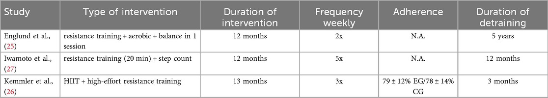 Table 2 shows a description of the physical activity intervention and detraining. The physical activity intervention ranged from 12 months (25, 27) to 13 months (26). In the included studies, different training modalities were used: resistance training (25, 26), balance training (25), aerobic (25), HIIT (26), and resistance training (10 min per day) combined with daily step count (27). The training frequency ranged from 2 (25) to 5 per week (27). The detraining periods range from 3 months (26) to 5 years (25).