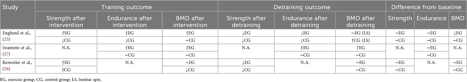 No significant functional or strength or BMD changes were observed in any group comparing post-detraining and baseline testing in Iwamoto et al. (27) and Kemmler et al. (26). On the other hand, Englund et al. (25) noted a deterioration in BMD after detraining compared to baseline in the exercise group, while the control group improved (25).
