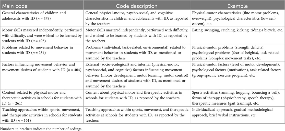 The study's empirical findings, generated based on evaluating the processed text-based data using qualitative content analysis according to Kuckartz (30), are presented below. The content analysis yielded six principal thematic codes. The principal codes are as follows: (a) general characteristics in children and adolescents with ID, (b) motor skills mastered independently, performed with difficulty and wished to be learned by students with ID, (c) problems related to movement behavior in students with ID, (d) factors influencing movement behavior and movement desires of students with ID, (e) content related to physical-motor and therapeutic activities in schools for students with ID, and (f) teaching approaches within sports, movement, and therapeutic activities in schools for students with ID. Table 1 presents the main codes generated in the analysis with brief descriptions and examples. The supplementary material includes the generated code system in tabular form to clarify further and enhance the data obtained. The final differentiated code system developed can be obtained from the first author upon request.