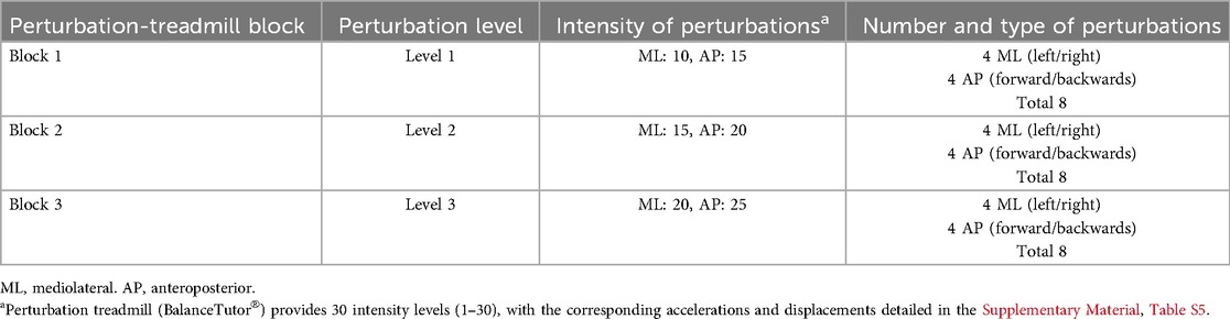 The perturbation treadmill protocol consisted of three blocks with increasing levels of difficulty (Table 1). Each block included eight perturbations that randomly occurred either in the forward (treadmill slows down), backward (treadmill accelerates), or sideways (treadmill moves sideways) direction. Two types of perturbations were tested: mediolateral (four to the left and right) and anteroposterior (four forward and backward). Both types were applied at each difficulty level (see Supplementary Materials, Table S5).