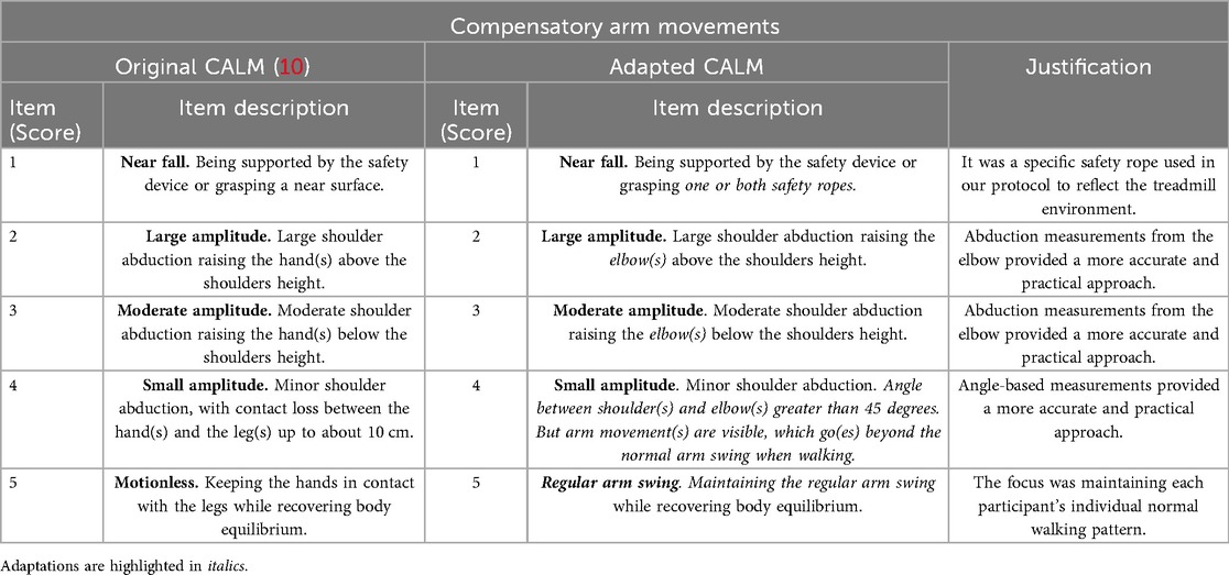 The adaptations made to create the A-CALM scale are summarized in Tables 2, 3. The basic structure of the original CALM scale (10), with its two modules—“Compensatory Arm Movements” and “Compensatory Leg Movements”—was maintained, as was the scoring system. Similar to the original CALM, participants' responses to treadmill perturbations are filmed in the frontal plane using a commercial digital camera for offline analysis based on the A-CALM scale. The main adaptations involved the description of individual items to better capture balance recovery during walking.