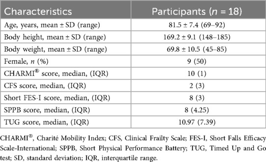 The study included 18 participants (mean age: 82 ± 7 years, body height 169.2 ± 9.1 cm and body weight 69.8 ± 10.5 kg) with an even gender distribution (Table 4). Mobility and frailty assessments revealed no significant impairments (median CHARMI®: 10, CFS: 2). The median FES-I score of 8 indicated a low concern about falling. A median SPPB score of 8 reflected moderate physical performance, while a median TUG time of 11.0 s indicated mild mobility impairments. Overall, the sample was mildly physically impaired, with subtle mobility limitations that may increase fall risk in challenging situations.