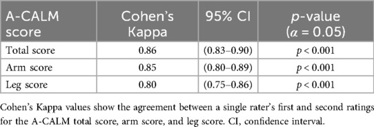 Results: Overall, 288 perturbations were recorded. The A-CALM scale demonstrated strong intra-rater reliability, with Kappa values of 0.85 (95% CI = 0.80–0.89) for arm scores, 0.80 (95% CI = 0.75–0.86) for leg scores, and 0.86 (95% CI = 0.83–0.90) for total scores, indicating a high level of consistency in the raters' assessments across time. Inter-rater reliability was substantial for arm scores (K = 0.67, 95% CI = 0.62–0.72) but moderate for leg scores (K = 0.48, 95% CI = 0.44–0.51) and total scores (K = 0.41, 95% CI = 0.38–0.44) with significant values in all analyses (p < 0.001).