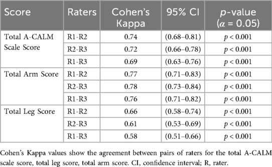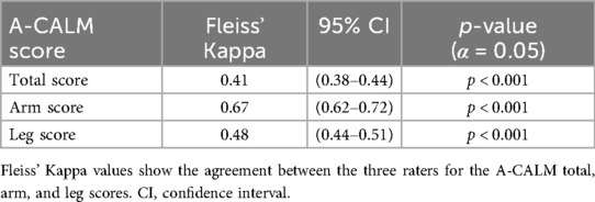 The inter-rater reliability of the A-CALM total score was moderate, with a Fleiss' Kappa value of 0.41 (95% CI = 0.38–0.44) with significant values in all analyses (p < 0.001) across the three raters (Table 6). Agreement was higher for the arm score (K = 0.67, 95% CI = 0.62–0.72), while the leg score demonstrated moderate reliability (K = 0.48, 95% CI = 0.44–0.51).