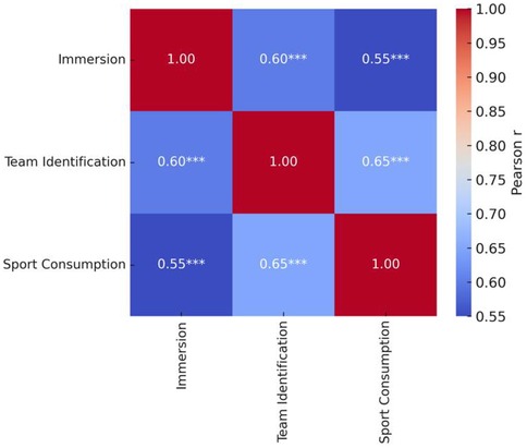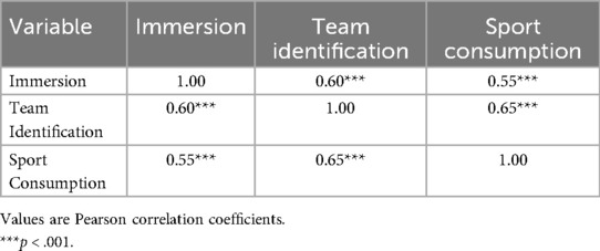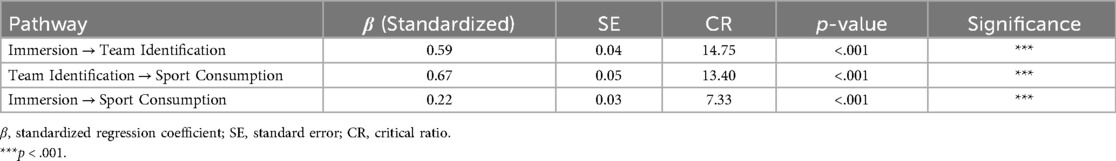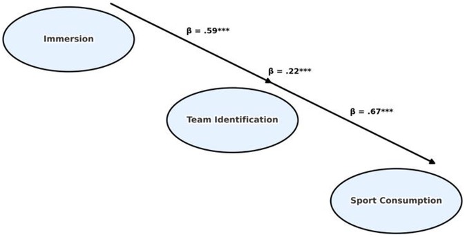 Correlation analyses (Table 2) revealed significant positive relationships among all three variables (p < .001). Immersion and team identification were moderately correlated (r = 0.60), whereas the strongest association occurred between team identification and sports consumption behavior (r = 0.65), delineating a continuous pathway from emotional investment to behavioral orientation. Although immersion and sports consumption behavior were also significantly associated (r = 0.55), the comparatively weaker coefficient suggests that behavioral responses rely more heavily on the mediating role of team identification.
