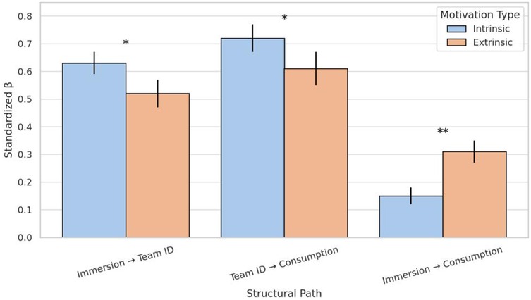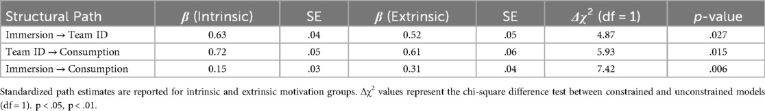 In contrast to the above path, the direct path from immersion to sports consumption exhibited the same direction in both groups. However, the path coefficient was higher in the extrinsic regulation group (β = 0.31) and significantly superior to that in the intrinsic group (β = 0.15), with this difference also being statistically significant (Δχ2 = 7.42, p = .006). This finding reveals that for individuals reliant on external motivators, immersive experiences are more readily converted into consumption behavior directly, bypassing the motivational transformation mediated by team belonging.