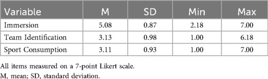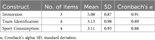 Team identification was assessed using the revised “Team Identification” scale by Lock, Funk, and Doyle (17), capturing cognitive, affective, and symbolic dimensions. Four items were retained, such as “I feel like I am part of this team” and “The success of this team makes me proud,” reflecting the self-affiliation–emotional identification–behavioral orientation logic of social identity theory. The scale demonstrated strong construct validity (Cronbach's α = 0.89, CR = 0.92, AVE = 0.76).