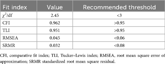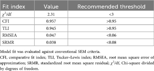 Second, the latent-variable measurement model was tested using confirmatory factor analysis (CFA). Standardized factor loadings were estimated with maximum likelihood (ML) procedures. Composite reliability (CR), average variance extracted (AVE), and Cronbach's α were computed to assess internal consistency, convergent validity, and reliability of latent variables. Model fit was evaluated with multiple indices, including χ2/df, Comparative Fit Index (CFI), Tucker–Lewis Index (TLI), and Root Mean Square Error of Approximation (RMSEA), to ensure the adequacy and validity of the measurement structure.