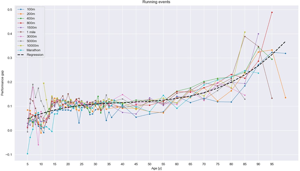 Line chart showing performance gaps in various running events across different ages. Events include 100m to marathon. Performance gaps generally increase with age, notably after 60. A black dashed line represents a regression trend.