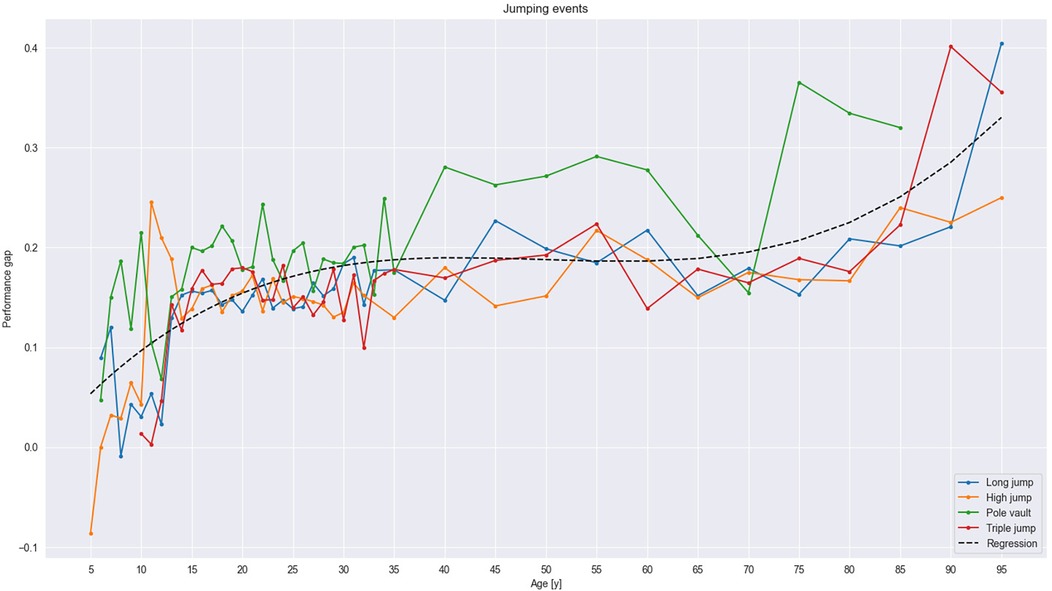 Among senior athletes, the long jump showed similarities with the high jump in the performance sex gap, both of which were approximately 15%. The gap in the triple jump, at approximately 17%, was somewhat larger than in those events. However, the widest gap in any jumping event, at approximately 20%, occurred with the pole vault. In that event, the increased gap among masters athletes began at 35 years of age save an outlier among 70–74-year-olds. Even so, the gap remained stable in all other jumping events until the age of 65 years, when it began rising slightly until 80 years of age, after which a steep increase occurred. The development of the performance gap in jumping can be depicted by the following polynomial regression line: 1.69 × 10−6×3 − 2.51 × 10−4×2 + 1.21 × 10−2× − 1.05 × 10−3.