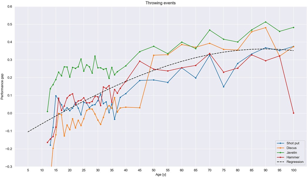 Between events, the greatest performance sex gap and the greatest increase in the gap occurred in the javelin throw, which developed similarly to the gaps in the other throwing events from the mentioned 25% among senior athletes to approximately 50% among the oldest masters. The trendline in javelin also differed from the rest of the throwing events by increasing steeply at the beginning of the masters cohorts between 35 and 45 years of age. Another steep increase occurred in hammer throw just after the senior level, from approximately 10% at the age of 35 to 30% among 70–74-year-olds. The development of the gap in shot put, meanwhile, was comparable with that in the hammer throw, with a roughly 10% difference observed among youth and a decrease to approximately 6% among seniors. However, the transfer to the masters cohorts was smoother in the shotput than in the hammer throw, and performance gap remained below 20% until the age of 55 years, when it began increasing. In the discus, the performance gap in juniors and seniors inverted and hovered around 0%, thereby indicating that women's outperformed men at those ages. The gap in discus rose dramatically, from approximately 4% at 45 years of age to 30% at approximately 50 and continued to increase among masters, where the trend became comparable with that of the javelin throw.
