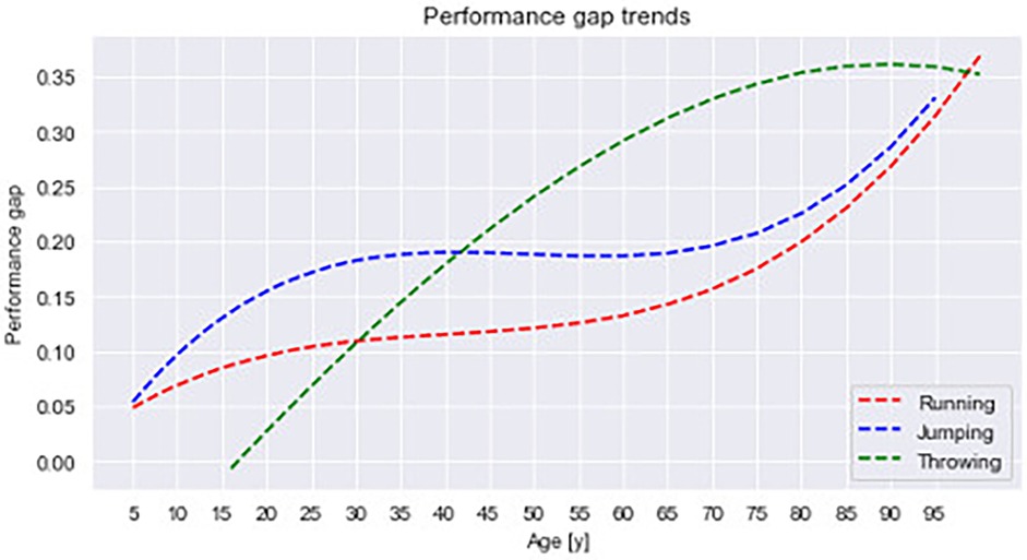 In response, in our study we aimed to describe how the performance sex gap changes in different age groups across the lifespan, notably in track-and-field events, grouped into the more general categories of running, jumping, and throwing. Because those event categories collectively represent a great deal of the variability in athletic behavior, our results would also provide more general knowledge about the development of the performance gap across the lifespan and illuminate related differences between the sexes.