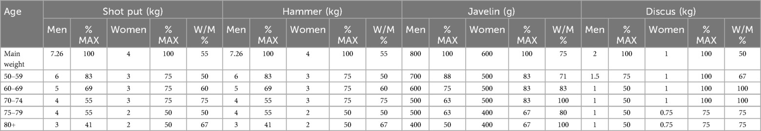 Table 1. Weight of throwing implements used by adult athletes. The senior weight is used by athletes 20–49 years old, after which the master's implement is scaled. % MAX describes the percentage of senior's equipment (i.e., weight for masters women/weight for senior women and weight for masters men/weight for senior men). W/M% indicates the weight ratio between the sexes (i.e., women/men). For a detailed overview of scaling, see Supplementary Appendix S2.