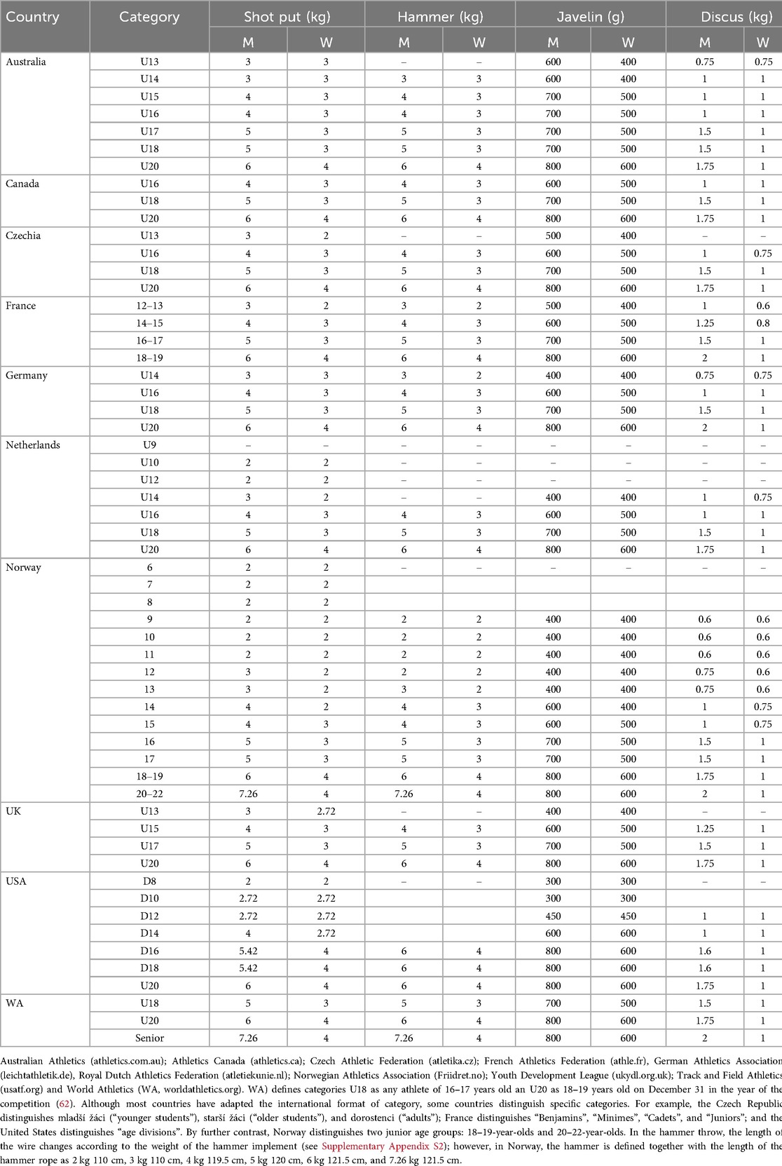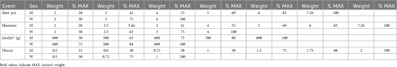 Table 2. Weight of throwing implements used by youth athletes (i.e., children and juniors). Weight is displayed in kilograms except for the javelin (*), for which the units are grams. The weight of the throwing implements is shown as % MAX, meaning the percentage of the seniors’ equipment (i.e., weight of the children's implement/senior weight). A detailed overview of equipment used by youth in various countries appears in Table 3 below.