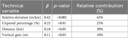 Multiple regression analysis assessed the specific influence of each technical variable on collective performance variability. Relative elevation per kilometer had the strongest effect (β = 0.42, p < 0.001), followed by the percentage of unpaved surfaces (β = 0.23, p < 0.01), total distance (β = 0.18, p < 0.05), and total vertical gain (β = 0.11, p < 0.05) (Table 2). Specifically, in the most demanding cluster (cluster 5), the influence of relative elevation increased significantly (β = 0.62, p < 0.001), highlighting its critical relevance in highly technical stages.