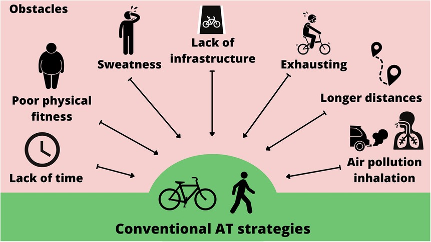Figure 1. Representative barriers that discourage the adoption of conventional active transportation modes, including cycling and walking. AT, active transportation.